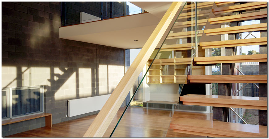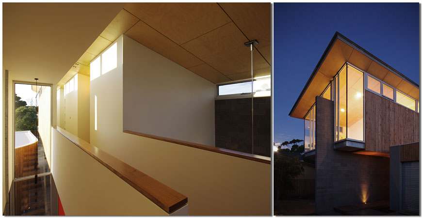 The Beach house was designed as a linear, single width room floor plan to allow cross ventilation to flow through every room. A two storey void connects the downstairs open-plan living spaces with an open stairway and upper floor study. A bridge spans the void and provides a connection to the sleeping areas.